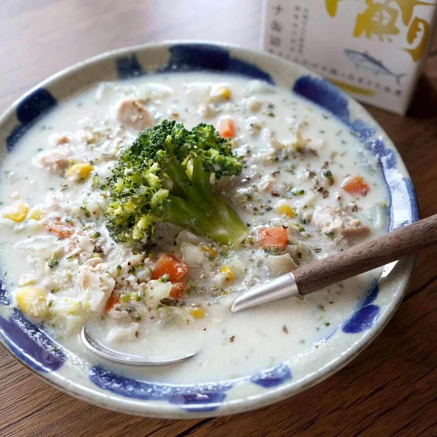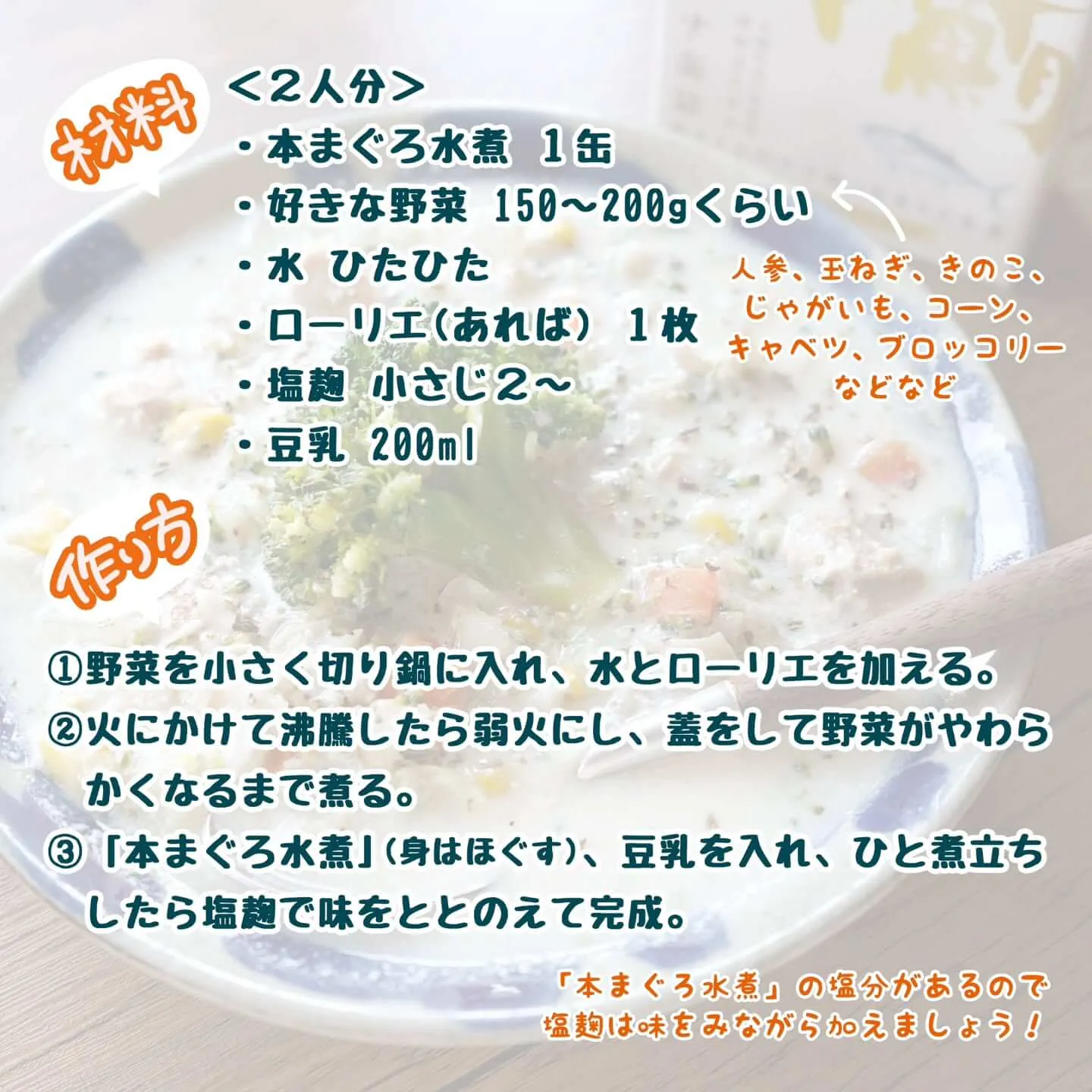 ③『本まぐろ水煮』(身はほぐす)、豆乳をいれ、ひと煮立ちしたら塩麹で味を整えて完成。