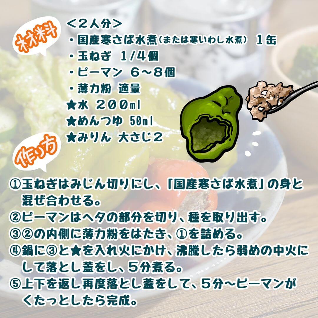 さば缶で簡単!国産寒さば水煮を使った、ピーマンのさば詰め煮レシピです。下処理いらずで魚料理が手軽に作れるから、忙しい日や料理が苦手な方にもおすすめ♪